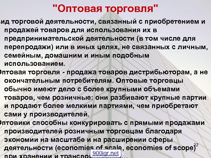 "Оптовая торговля" вид торговой деятельности, связанный с приобретением и продажей товаров для использования их в предпринимательской деятельности (в том числе для перепродажи) или в иных целях, не связанных с личным, семейным, домашним и иным подобным использованием. Оптовая торговля - продажа товаров дистрибьюторам, а не окончательным потребителям. Оптовые торговцы обычно имеют дело с более крупными объемами товаров, чем розничные: они разбивают крупные партии и продают более мелкими партиями, чем приобретают сами у производителей. Оптовики способны конкурировать с прямыми продажами производителей розничным торговцам благодаря экономии на масштабе и на расширении сферы 22 деятельности (economies of scale, economies of scope) 900 igr. net