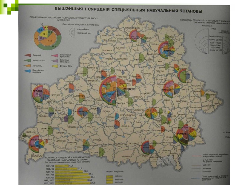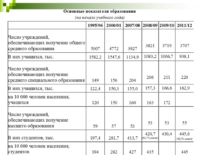 Доля образования в ВВП: 1990г. – 2,5%, 2010г. – 4%, 2011г. – 4,15%. В образовании – 9,5% занятого населения РБ (2010г.)