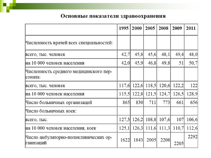 Увеличивается процент детей, находящихся на грудном вскармливании (в 2000г. до 12 месяцев – 16%, в 2010г. – 32,9%). Число посещений врачей (на амбулаторном приеме и на дому) на одного жителя в год – 13,4 (в 2000г. – 12,2).