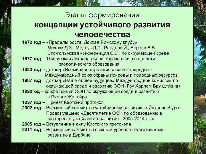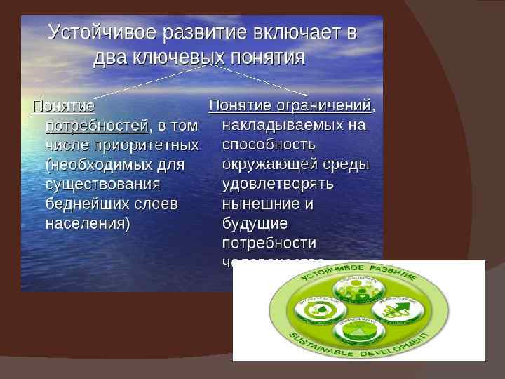 Что же такое устойчивое развитие? Под устойчивым развитием понимается такое движение вперёд, при котором достигается удовлетворение жизненных потребностей не только нынешнего, но и будущих поколений людей, речь идёт о равенстве возможностей развития как ныне живущих, так и последующих поколений. А это предполагает готовность людей, живущих сегодня, к разумному ограничению своих потребностей во имя своих детей, внуков, правнуков. Устойчивое развитие — это такая стратегия (направ ление) социо природного развития, которая обеспечивает выживание и непрерывный прогресс общества и не разрушает окружающую природную среду.
