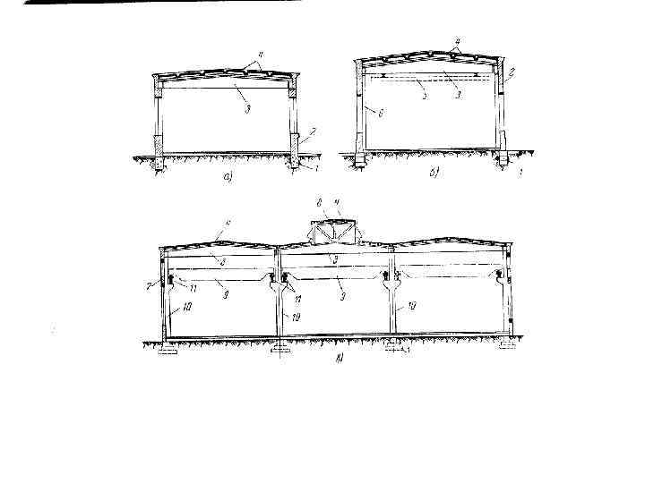Рис. 6 -1. Одноэтажные промышленные здания. • а — с несущими наружными стенами без пилястр; • б — то же с пилястрами; • в —трехпролетное здание с железобетонным каркасом; 1 — фундамент; 2 — несущая наружная стена; 3 — балка покрытия; 4 — плита покрытия; 5 — подвесная кран балка; 6 — пилястра; 7 — самонесущая наружная стена; 8 — фо нарь; 9 — электрический мостовой кран; 10 — колонна; 11 — подкрановая балка.