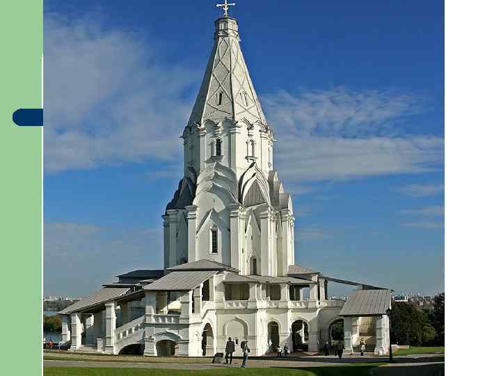 Церковь Вознесения в селе Коломенском l l l Вознесенский шатровый храм был построен в 1532 году. Это первый каменный шатровый храм. Высота шатра 28 метров, всей церкви – 62 метра. Заложен был храм по повелению Василия III в честь появления долгожданного сына и наследника престола – Ивана IV Предположительно строили храм итальянские зодчие, возможно, Петрок Малый, прибывший в Москву в 1528 г.