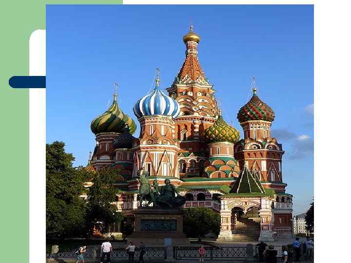 Покровский собор храм Василия Блаженного. l l l Храм Покрова Божией Матери (собор Василия Блаженного) главный храм Красной площади. Построен в середине XVI века (1555 – 1561 гг. ) по указу Ивана Грозного в честь взятия Казанского. 1 октября 1552 года, в праздник Покрова Божией Матери, начался штурм Казани, который закончился победой русского войска. Вокруг центрального шатра расположены восемь куполов, ни один из которых не повторяет другой по форме и рисунку. Архитекторы Постник Яковлев и Барма. Современную цветную окраску собор получил в XVII веке, первоначально был белым.