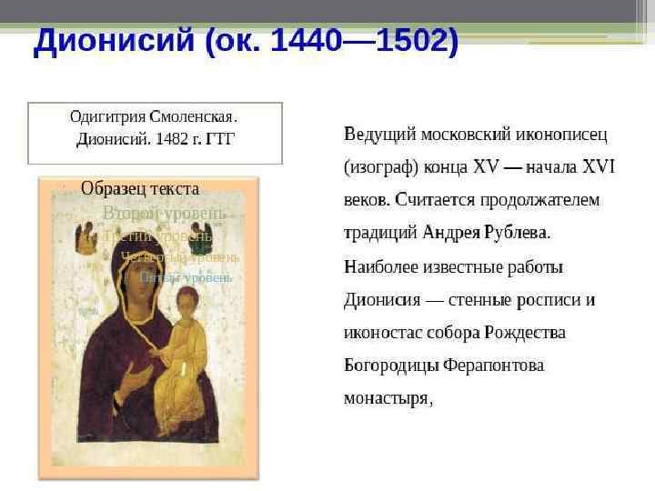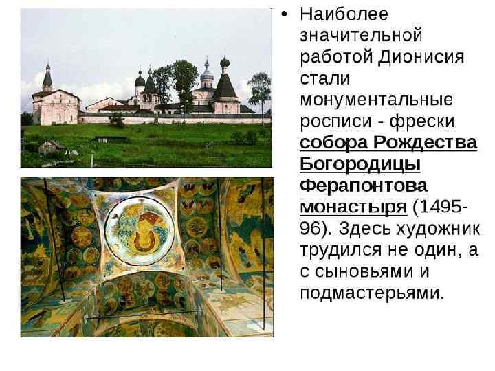 Дионисий с сыновьями и соратниками Ферапонтов Монастырь (фрески и иконы собора Рождества Богородицы) Воскресение – Сошествие во ад. Дионисий и мастерская Иоанн Предтеча Богоматерь Одигитрия