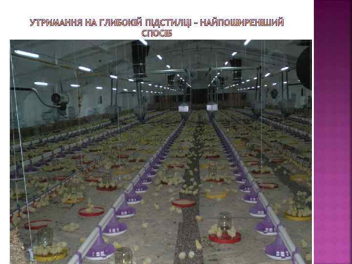 Вирощування на глибокій підстилці: Використовують обладнання типу КРМ (вітчизняного виробництва), “Big Dutchman" (Німеччина). Пташник поділяють на секції місткістю 15002000 голів. До 4 -тижневого віку фронт годівлі – 5 см/гол. , а з 5 -го тижня і до кінця вирощування – 10 см. Фронт напування – не менше 3 см/гол або 12 -15 гол/ніпель. Годівниці та напувалки мають бути розміщені на рівні спини курчат.
