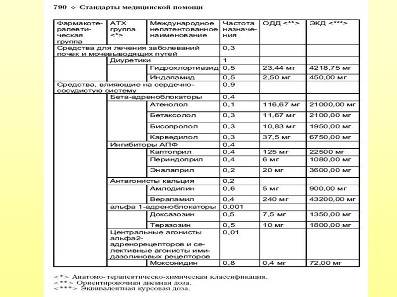ЛП включенные в стандарты МПБ артериальной гипертензией Диуретики – Гидрохлортиазид, Индапамид 2. Бета – адреноблокаторы – Атенолол, Бисопролол, Бетаксолол, Карведилол 3. ИАПФ – Каптоприл, Периндоприл, Эналаприл; БРАТ- Лозартан, Валсартан 4. Блокаторы Са-каналов – Амлодипин, Верапамил 5. Альфа 1 адреноблокаторы – Доксазозин, Теразозин 6. Агонисты α1 І1 рецепторов - Моксонидин