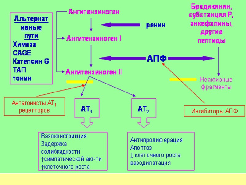 Проренин Ренин Ангиотензиноген Ангиотензин - I Ангиотензин - II Ангиотензиновый рецептор I типа Ангиотензин - III Ангиотензин - I-7 Калликреин Кининогены Кинины (бради-) АПФ Эндо-пептидаза миоцит Продукты инактивации вазоактивных пептидов + - Карбоксипептидаза Эндопептидаза Аминопептидаза Продукты инактивации вазоактивных пептидов Общее свойство всех ингибиторов АПФ - влияние на ренин-ангиотензин-альдостероновую и каллекреин-кининовую системы регуляции артериального давления сосудистой стенки