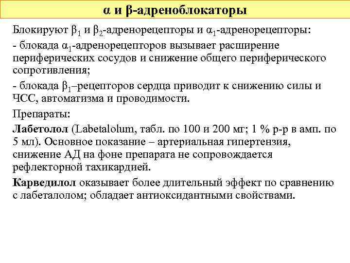 α и β-адреноблокаторы Блокируют β 1 и β 2 -адренорецепторы и α 1 -адренорецепторы: - блокада α 1 -адренорецепторов вызывает расширение периферических сосудов и снижение общего периферического сопротивления; - блокада β 1–рецепторов сердца приводит к снижению силы и ЧСС, автоматизма и проводимости. Препараты: Лабетолол (Labetalolum, табл. по 100 и 200 мг; 1 % р-р в амп. по 5 мл). Основное показание – артериальная гипертензия, снижение АД на фоне препарата не сопровождается рефлекторной тахикардией. Карведилол оказывает более длительный эффект по сравнению с лабеталолом; обладает антиоксидантными свойствами.