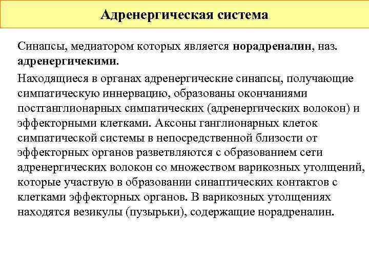Адренергическая система Синапсы, медиатором которых является норадреналин, наз. адренергичекими. Находящиеся в органах адренергические синапсы, получающие симпатическую иннервацию, образованы окончаниями постганглионарных симпатических (адренергических волокон) и эффекторными клетками. Аксоны ганглионарных клеток симпатической системы в непосредственной близости от эффекторных органов разветвляются с образованием сети адренергических волокон со множеством варикозных утолщений, которые участвую в образовании синаптических контактов с клетками эффекторных органов. В варикозных утолщениях находятся везикулы (пузырьки), содержащие норадреналин.