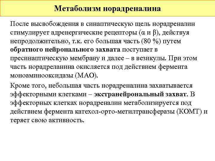 Метаболизм норадреналина После высвобождения в синаптическую щель норадреналин стимулирует адренергические рецепторы (α и β), действуя непродолжительно, т. к. его большая часть (80 %) путем обратного нейронального захвата поступает в пресинаптическую мембрану и далее – в везикулы. При этом часть норадреланина окисляется под действием фермента моноаминооксидазы (МАО). Кроме того, небольшая часть норадреналина захватывается эффекторными клетками – экстранейрональный захват. В эффекторных клетках норадреналин метаболизируется под действием фермента катехол-орто-метилтрансферазы (КОМТ) и теряет свою активность.