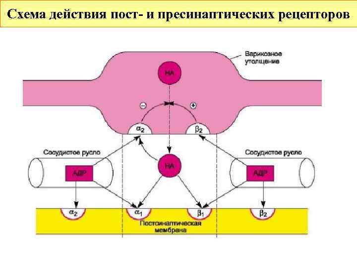 Адренорецепторы подразделяются на α и β типы, которые находятся на постсинаптической, пресинаптической мембране и в органах, не получающих адренергической иннервации (внесинаптически). Функции α-адренорецепторов α 1 (постсинаптические) – повышение тонуса гладких мышц сосудов (сужение сосудов); сокращение радиальной мышцы радужки глаза (мидриаз); α 2 (пресинаптические) – угнетение выделения норадреналина в синаптическую щель в адренергических волокнах; α 2 (внесинаптические) – повышение тонуса сосудов (находятся в эндотелии сосудов); угнетение выделения инсулина клетками поджелудочной железы; угнетение липолиза (распад жиров) в жировой ткани, повышение агрегации тромбоцитов.