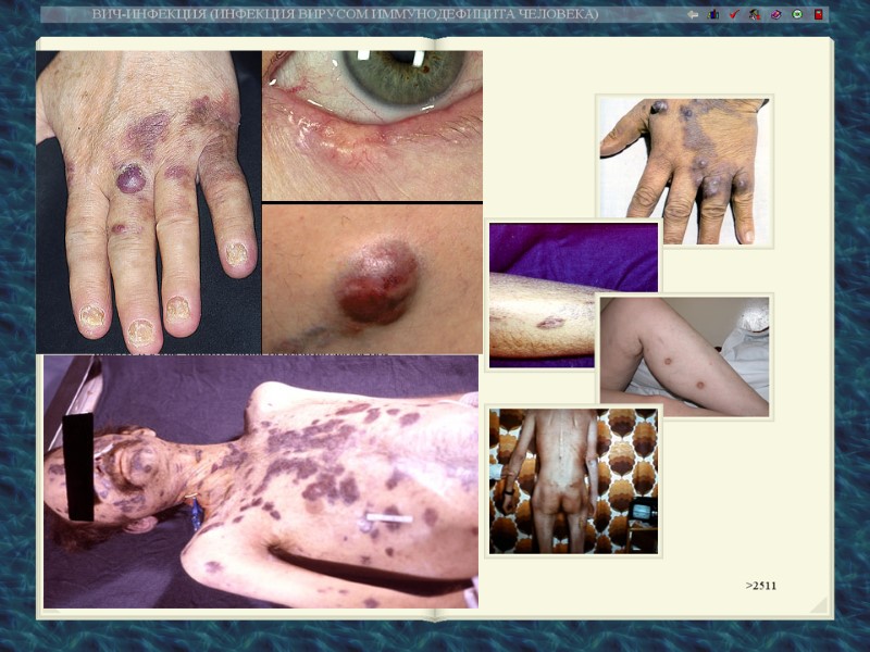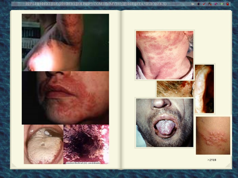 Поражения кожи и слизистых оболочек Поражения кожи и слизистых оболочек при ВИЧ-инфекции относятся к постоянным проявлениям клиники, они имеют место у 84% больных. Среди патологии кожи наиболее часто встречаются вирусные (простой герпес, опоясывающий герпес, «волосатая» лейкоплакия рта, вызванная вирусами Эпштейна-Барр экзантема, остроконечные кондиломы, вызванные вирусом папилломы, кореподобная и краснушноподобная экзантема), бактериальные (пиодермия шанкриформная, стрепто- стафилодермия, кожно-слизистые язвы, бактериальные абсцессы, фурункулез, фолликулит, импетиго, экзема, микобактериальная инфекция, актиномикоз, атипический сифилис, синдром "обожженной кожи"), микотические (кандидоз, дерматомикозы, криптококкоз, гистоплазмоз, отрубевидный лишай) паразитарные (чесотка) инфекции, сосудистые поражения (васкулиты, телеангиэктазии, геморрагии, тромбоцитопеническая пурпура), опухоли (саркома Капоши, лимфома, плоский рак, миелома), папулосквамозные дерматозы (себорейный дерматит, псориаз, розовый лишай). Группу характерных для ВИЧ-инфекции патологии слизистых оболочек входят ангулярный стоматит, афтозный, простой и некротический гингивит. Наряду с кожей и слизистыми оболочками нередко у больных выявляется патология волос и ногтей в виде истончения волос, гипертрихоза, очаговой алопеции, деформации ногтей, изменение их цвета.