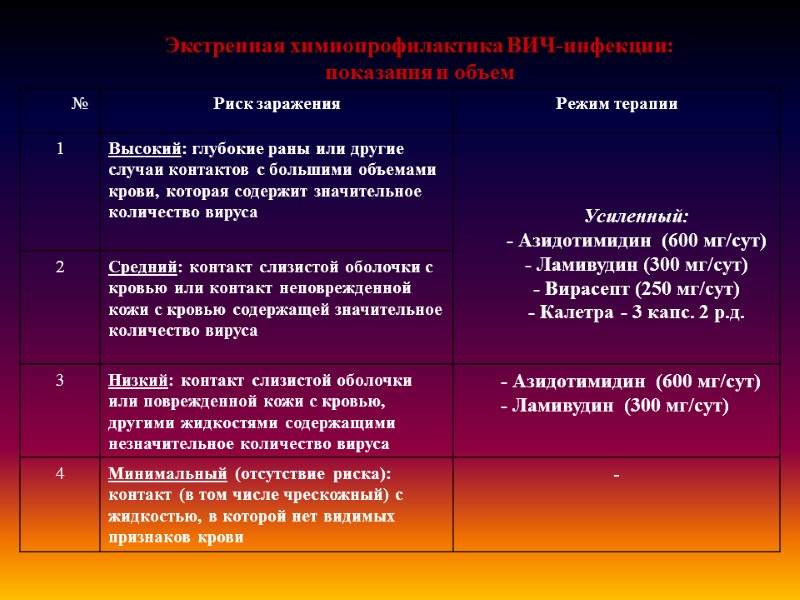 Экстренная химиопрофилактика профессионального заражения ВИЧ Экстренная химиопрофилактика профессионального заражения ВИЧ актуальна для медицинских работников: хирургов, стоматологов, акушеров-гинекологов, процедурных медицинских сестер, клинических лаборантов, трансфузиологов и др. Также сотрудники, работающие в тесном контакте с потенциально инфицированными биологическими жидкостями: Лаборанты иммунологических, биохимических, бактериологических, молекулярно-генетических и других лабораторий). Определяющим фактором эффективности профилактики является время от момента инфицирования («медицинской аварии») до начала химиопрофилактики. Наибольшая эффективность достигается в первые часы. Начало профилактической химиотерапии позже 72 часов считается необоснованным и малоэффективным.