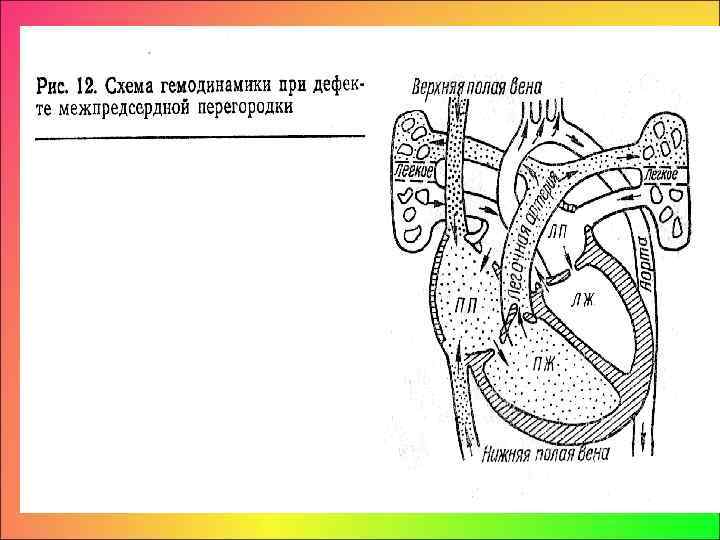 • Вследствие большей емкости и растяжимости правого предсердия давление в нем на 3— 5 мм. рт. ст. ниже, чем в левом. • Поэтому при дефекте межпредсердной перегородки происходит сброс крови из левого предсердия в правое. • Сброс крови слева направо, благодаря большой резервной возможности и низкой сопротивляемости сосудистого русла легких, не приводит к быстрому и значительному повышению давления в правом желудочке. • Возрастают объемная нагрузка и работа правого желудочка. • При этом фиброзное кольцо легочной артерии не растягивается в достаточной степени.
