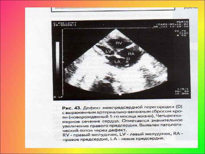 • Ультразвуковое исследование, являющееся наиболее информативным в постановке диагноза ДМПП, выявляет: • непосредственную визуализацию дефекта, • увеличение размеров правого желудочка и правого предсердия, • парадоксальный характер движения межжелудочковой перегородки, наблюдаемый при выраженном артериовенозном сбросе при отсутствии легочной гипертензии