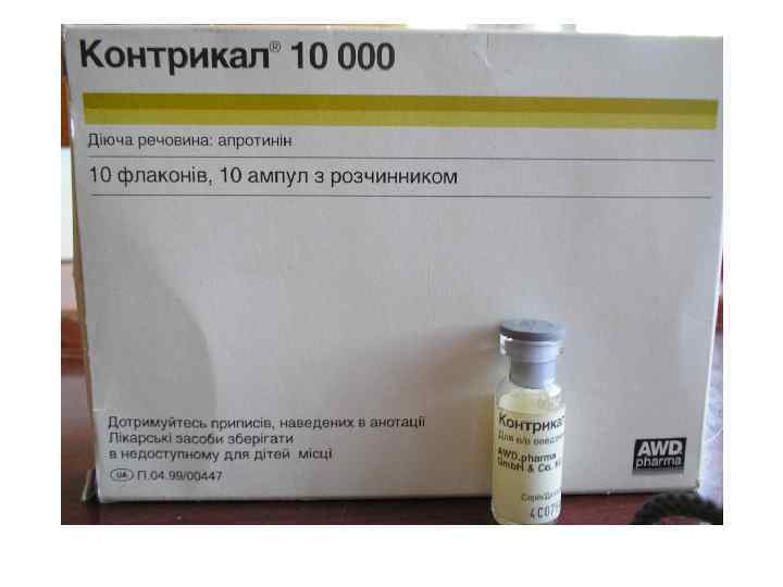 Contrycal 10 000 Ед в/в кап. На физ растворе • Из поджелудочной (легких) крупного рогатого скота • ПЭ- аллергические реакции, тошнота
