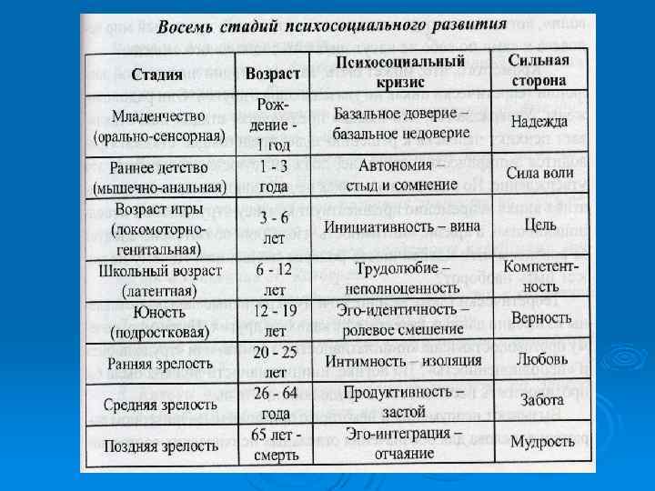 Жизненные циклы личности по Э. Эриксону В этой концепции детально описан механизм развития личности. Суть этого механизма – возникновение на определенной стадии развития особого кризиса и его преодоление. Если кризис разрешается удовлетворительно, это обогащается положительным компонентом, что повышает возможность дальнейшего успешного развития, в противном случае – в Эго встраивается негативный компонент, что снижает возможность успешного развития личности. Желательно, чтобы человек адекватно разрешил каждый кризис. Тогда у него появляется возможность подойти к очередной стадии более подготовленной и зрелой личностью. .