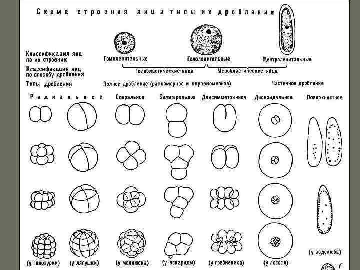 Дробление Желтка мало Желтка много Дробление полное (голобластическое) Анархическое Дробление неполное (меробластическое) Кишечнополостные и паразитические Плоские черви Поверхностное Спиральное Ресничные черви, Моллюски, Кольчатые черви Радиальное Ланцетник, Круглоротые, Осетровые рыбы, Амфибии, Иглокожие Билатеральное Круглые черви Насекомые Дискоидальное Рыбы, Рептилии, Птицы Дробление полное равномерное Млекопитающие