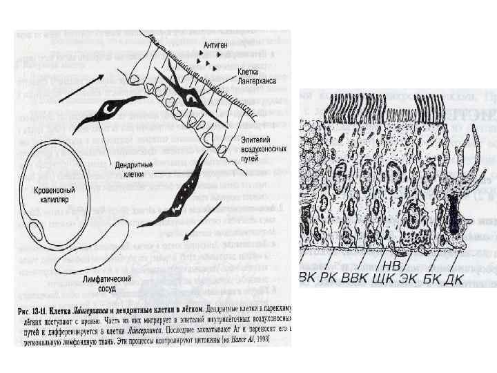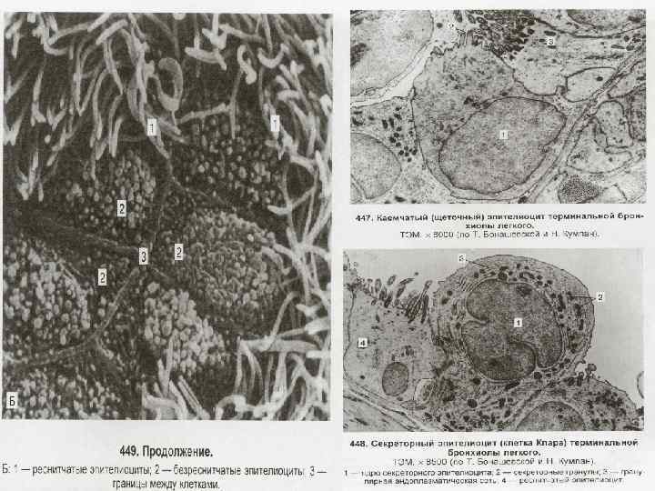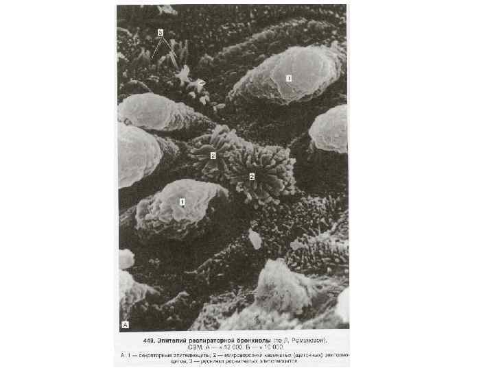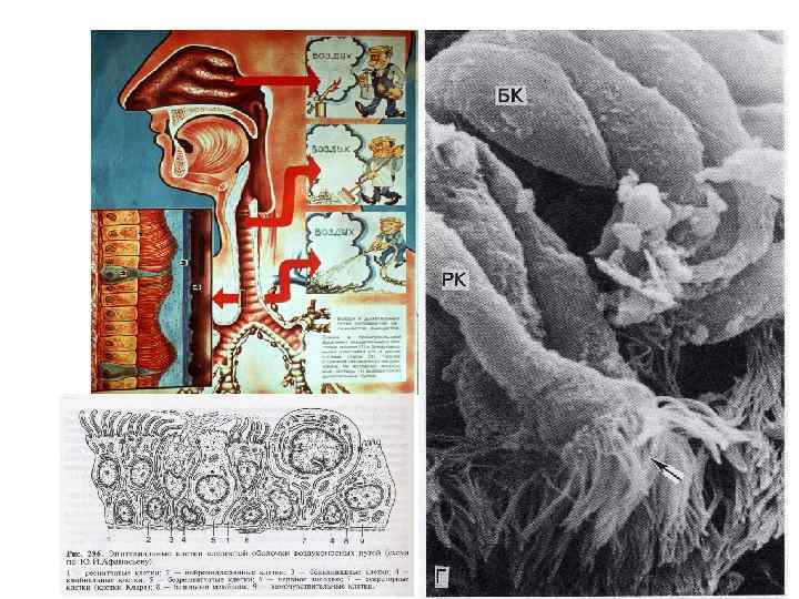 Эпителий воздухоносных путей – однослойный многорядный реснитчатый Основные типы клеток: • • Реснитчатые Бокаловидные базальные Вставочные промежуточные Щеточные Экзокриноциты (кл. Клара) Эндокринные Дендритные Мукоцилиарный транспорт – основной механизм очищения воздуха. Наружный (гель), толщина – 2 мкм Надклеточный слой слизи Внутренний (золь), толщина – 5 мкм