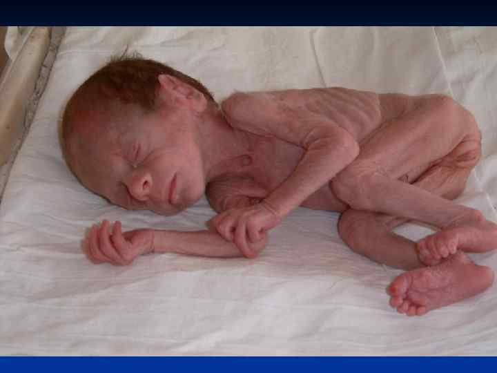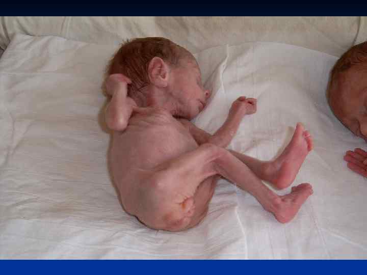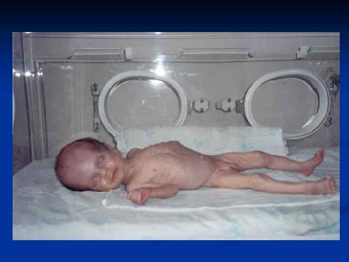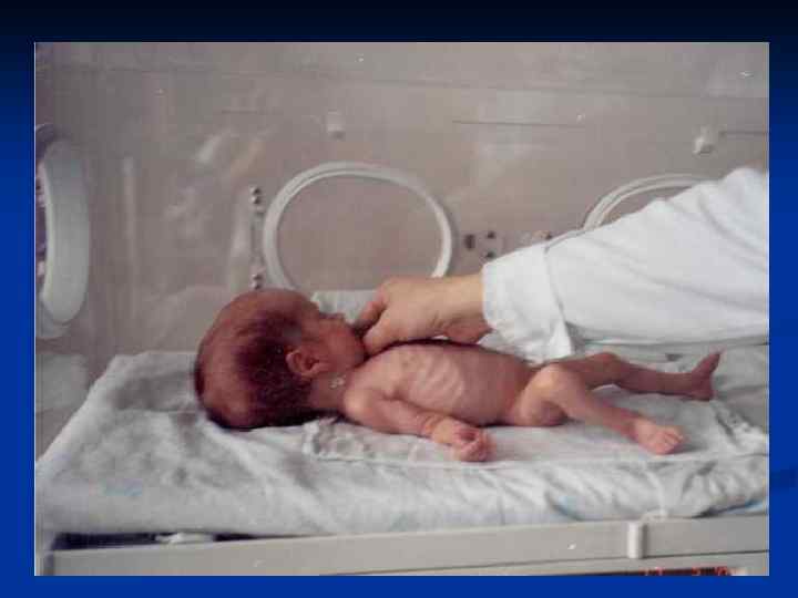 Диагностические критерии недоношенных детей. n n Рождение на 28(24) - 37 недели гестации с массой тела у большинства детей от 1000( 500) до 2500 г, длиной тела 38(30) -47 см, окружностью головы 26(22) -34 см, груди 24(20)-33 см. Функциональная и морфологическая незрелость организма: ЦНС, легочной, сердечно-сосудистой систем (гипотония мышц, гипорефлексия, гипотермия, первичное недостаточное расправление легких и др. ) Снижение соотношения лецитин/сфингомиелин в околоплодных , бронхиальном и желудочном аспиратах. Внешние признаки незрелости.