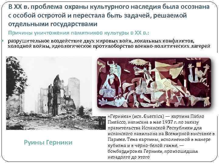 В ХХ в. проблема охраны культурного наследия была осознана с особой остротой и перестала быть задачей, решаемой отдельными государствами Причины уничтожения памятников культуры в ХХ в. : разрушительное воздействие двух мировых войн, локальных конфликтов, холодной войны, идеологическое противоборство военно-политических лагерей Руины Герники «Герни ка» (исп. Guernica) — картина Пáбло Пикáссо, написана в мае 1937 г. по заказу правительства Испанской Республики для испанского павильона на Всемирной выставке в Париже. Тема картины, исполненной в манере кубизма и в чёрно-белой гамме, — бомбардировка Герники, произошедшая незадолго до этого