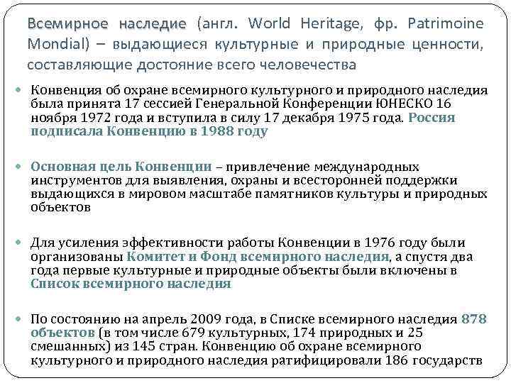Всемирное наследие (англ. World Heritage, фр. Patrimoine Mondial) – выдающиеся культурные и природные ценности, составляющие достояние всего человечества Конвенция об охране всемирного культурного и природного наследия была принята 17 сессией Генеральной Конференции ЮНЕСКО 16 ноября 1972 года и вступила в силу 17 декабря 1975 года. Россия подписала Конвенцию в 1988 году Основная цель Конвенции – привлечение международных инструментов для выявления, охраны и всесторонней поддержки выдающихся в мировом масштабе памятников культуры и природных объектов Для усиления эффективности работы Конвенции в 1976 году были организованы Комитет и Фонд всемирного наследия, а спустя два года первые культурные и природные объекты были включены в Список всемирного наследия По состоянию на апрель 2009 года, в Списке всемирного наследия 878 объектов (в том числе 679 культурных, 174 природных и 25 смешанных) из 145 стран. Конвенцию об охране всемирного культурного и природного наследия ратифицировали 186 государств