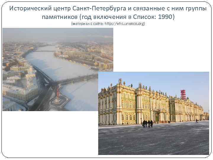Исторический центр Санкт-Петербурга и связанные с ним группы памятников (год включения в Список: 1990) (материал с сайта: http: //whc. unesco. org)