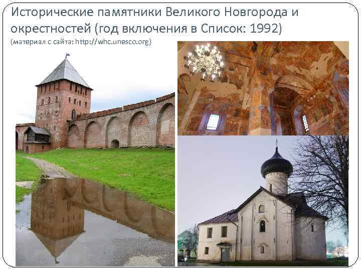 Исторические памятники Великого Новгорода и окрестностей (год включения в Список: 1992) (материал с сайта: http: //whc. unesco. org)