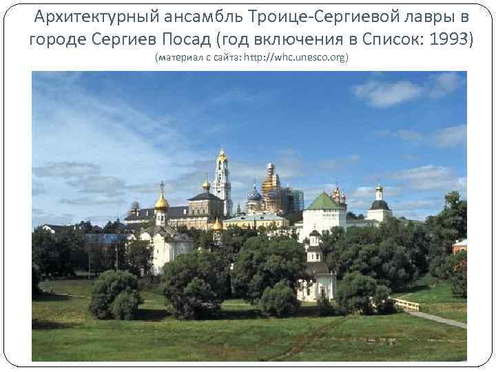 Архитектурный ансамбль Троице-Сергиевой лавры в городе Сергиев Посад (год включения в Список: 1993) (материал с сайта: http: //whc. unesco. org)