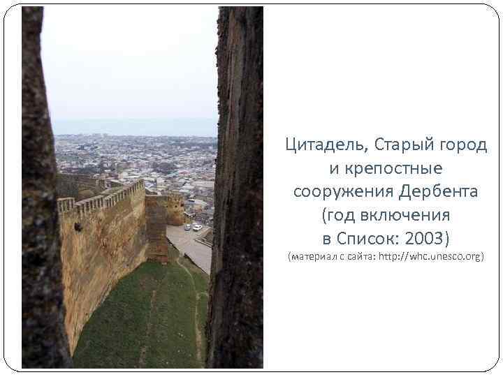 Цитадель, Старый город и крепостные сооружения Дербента (год включения в Список: 2003) (материал с сайта: http: //whc. unesco. org)