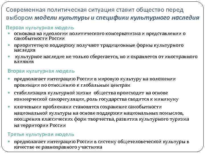 Современная политическая ситуация ставит общество перед выбором модели культуры и специфики культурного наследия Первая культурная модель основана на идеологии политического консерватизма и представлении о самобытности России приоритетную поддержку получают традиционные формы культурного наследия культурное наследие не только сберегается, но и охраняется от иностранного влияния Вторая культурная модель предполагает интеграцию России в мировую культуру на положении провинции по отношению к глобальным центрам стабилизация культурной жизни общества происходит на основе коммерческой саморегуляции, роль государства сводится к минимуму ключевыми проблемами становятся сохранение самобытности национальной культуры на основе поддержки национальных помыслов, поощрения классических форм творчества, развития культурного туризма на территории России Третья культурная модель предполагает интеграцию России в систему общечеловеческой культуры в качестве ее равноправного участника