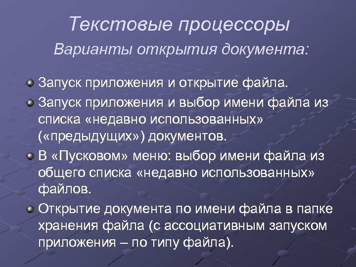 Текстовые процессоры Варианты открытия документа: Запуск приложения и открытие файла. Запуск приложения и выбор имени файла из списка «недавно использованных» ( «предыдущих» ) документов. В «Пусковом» меню: выбор имени файла из общего списка «недавно использованных» файлов. Открытие документа по имени файла в папке хранения файла (с ассоциативным запуском приложения – по типу файла).
