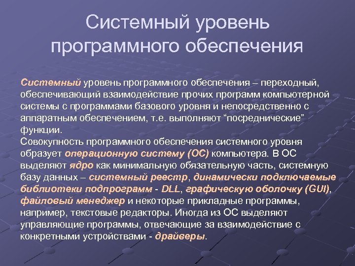 Системный уровень программного обеспечения – переходный, обеспечивающий взаимодействие прочих программ компьютерной системы с программами базового уровня и непосредственно с аппаратным обеспечением, т. е. выполняют “посреднические” функции. Совокупность программного обеспечения системного уровня образует операционную систему (ОС) компьютера. В ОС выделяют ядро как минимальную обязательную часть, системную базу данных – системный реестр, динамически подключаемые библиотеки подпрограмм - DLL, графическую оболочку (GUI), файловый менеджер и некоторые прикладные программы, например, текстовые редакторы. Иногда из ОС выделяют управляющие программы, отвечающие за взаимодействие с конкретными устройствами - драйверы.