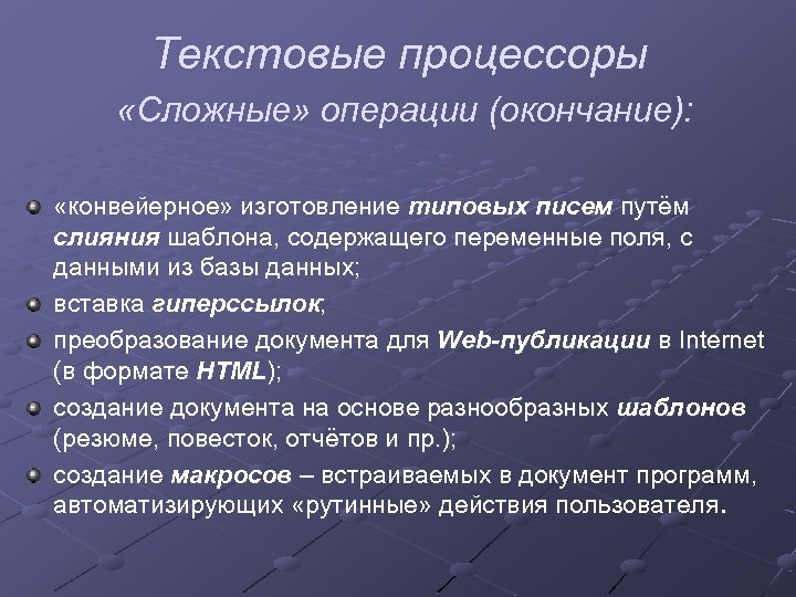 Текстовые процессоры «Сложные» операции (окончание): «конвейерное» изготовление типовых писем путём слияния шаблона, содержащего переменные поля, с данными из базы данных; вставка гиперссылок; преобразование документа для Web-публикации в Internet в (в формате HTML); создание документа на основе разнообразных шаблонов (резюме, повесток, отчётов и пр. ); создание макросов – встраиваемых в документ программ, автоматизирующих «рутинные» действия пользователя.