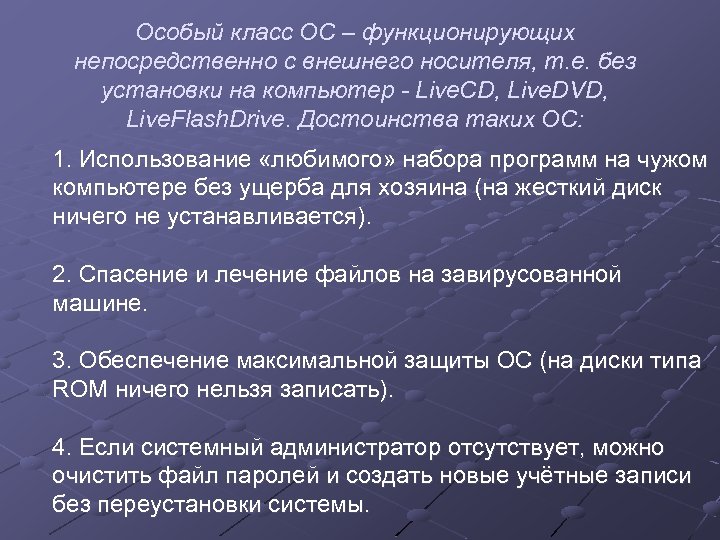 Особый класс ОС – функционирующих непосредственно c внешнего носителя, т. е. без установки на компьютер - Live. CD, Live. DVD, Live. Flash. Drive. Достоинства таких ОС: 1. Использование «любимого» набора программ на чужом компьютере без ущерба для хозяина (на жесткий диск ничего не устанавливается). 2. Спасение и лечение файлов на завирусованной машине. 3. Обеспечение максимальной защиты ОС (на диски типа ROM ничего нельзя записать). 4. Если системный администратор отсутствует, можно очистить файл паролей и создать новые учётные записи без переустановки системы.