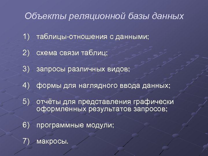 Объекты реляционной базы данных 1) таблицы-отношения с данными; 2) схема связи таблиц; 3) запросы различных видов; 4) формы для наглядного ввода данных; 5) отчёты для представления графически оформленных результатов запросов; 6) программные модули; 7) макросы.