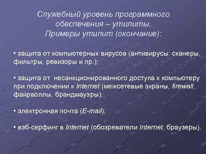 Служебный уровень программного обеспечения – утилиты. Примеры утилит (окончание): • защита от компьютерных вирусов (антивирусы: сканеры, фильтры, ревизоры и пр. ); • защита от несанкционированного доступа к компьютеру при подключении к Internet (межсетевые экраны, firewall, файрволлы, брандмауэры); • электронная почта (E-mail); • вэб-серфинг в Internet (обозреватели Internet, браузеры).