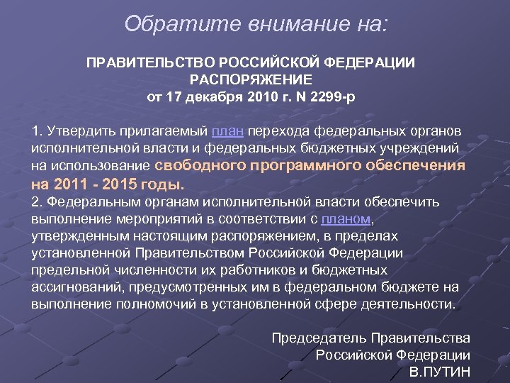 Обратите внимание на: ПРАВИТЕЛЬСТВО РОССИЙСКОЙ ФЕДЕРАЦИИ РАСПОРЯЖЕНИЕ от 17 декабря 2010 г. N 2299 -р 1. Утвердить прилагаемый план перехода федеральных органов исполнительной власти и федеральных бюджетных учреждений на использование свободного программного обеспечения на 2011 - 2015 годы. 2. Федеральным органам исполнительной власти обеспечить выполнение мероприятий в соответствии с планом, утвержденным настоящим распоряжением, в пределах установленной Правительством Российской Федерации предельной численности их работников и бюджетных ассигнований, предусмотренных им в федеральном бюджете на выполнение полномочий в установленной сфере деятельности. Председатель Правительства Российской Федерации В. ПУТИН