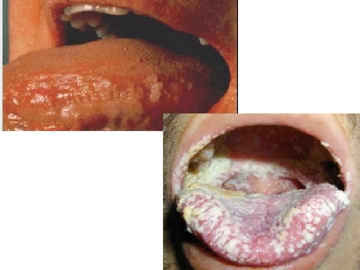 Саркома Капоши: слизистая рта. В патологический процесс часто вовлекаются регионарные лимфоузлы, реже другие органы. В процесс часто вовлекается твердое небо и прилегающие к нему десны, В представленном случае (снимок) у больного СПИДом саркома Капоши на слизистой рта сочетается с кандидозным стоматитом.