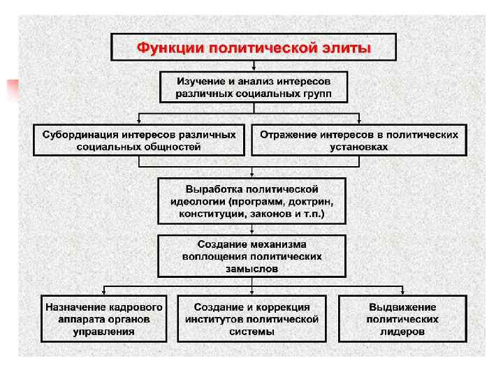 Политическая элита Определение n Привелегированная группа, которая занимает руководящие позиции во властных структурах и непосредственно участвует в выработке и принятии политических решений.