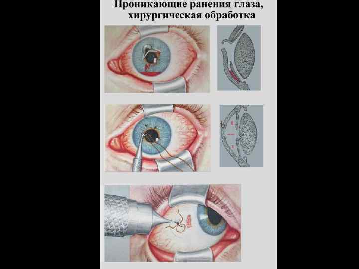 Первая помощь при проникающих ранениях глаза: • Закапывание антибактериальных средств (30% альбуцид, 0, 25% левомицетин, 0, 5% гентамицин и др. )Мази не применять! • Удаляются свободно лежащие инородные тела в конъюнктивальном мешке. Инородное тело торчащее в ране не убирать! • Асептическая моно или бинокулярная повязка • Срочное направление в глазной стационар