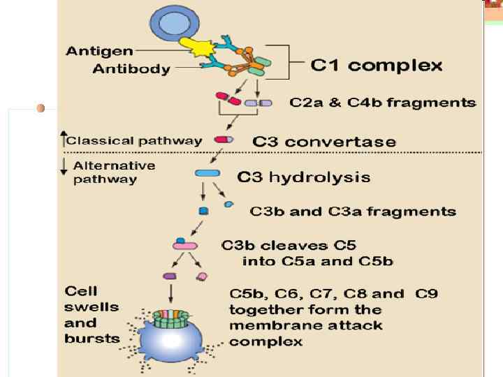 Активация системы комплемента приводит к активации литических ферментов комплемента С 5 -С 9, так называемого мембрано-атакующего комплекса (МАК), который, встраиваясь в мембрану микробных клеток, формирует трансмембранную пору, что приводит к гипергидратации клетки и ее гибели Пути активации комплемента: классический путь каскадная активация C 1 q, C 1 r, C 1 s, C 4, C 2 комплексом антигенантитело, с последующим вовлечением в процесс центрального компонента С 3 и С 5 -С 9 альтернативный путь непосредствення активация С 3 бактериями, вирусами, агрегированными иммуноглобулинами