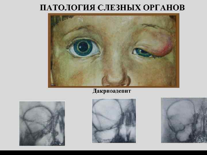 Классификация основных заболеваний слезных органов По этиологии: 1. Воспалительные 2. Врожденные 3. Травматические 4. Новообразования 5. По локализации: 6. Дакриоденит (воспаления слезной железы): Острый, Хронический 7. Заболевание слезной точки: Артезия (отсутствие), сужение, Атония (расширение). Дислокация, выворот, закупорка инородным телом 8. Заболевание слезного канальца: каналикулит (воспаление слезного канальца), Сужение его или заращение 9. Дакриоцистит (воспаление слезного мешка): Острый флегмонозный, хронический, травматический, новорожденных. 10. Сужение слезного носового канала.
