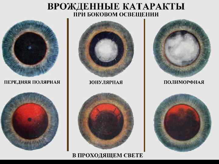 Классификация катаракт Врожденные: Ø Односторонние (15 %), двусторонние (85 %). Ø По форме – полярные, шовная, ядерная капсулярная, слоистая, пленчатая, полная. Ø По этиологии - наследственные (патология Ххромосомы); - внутриутробные (гипокальциемия, гипотириоз, сахарный диабет, токсоплазмоз, вирусные инфекции, краснуха). Ø Сочетанные с другими синдромными болезнями (Дауна, Холлермона, Морфана, Лоу и др. )