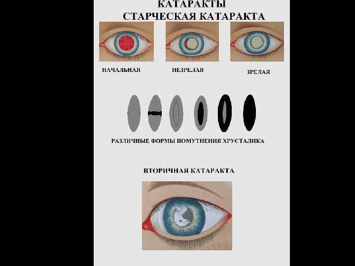 Классификация катаракты ü Начальная (спицеобразные помутнения, visus-десятые); ü Незрелая (выражена тень от радужки, visus-сотые); ü Зрелая (исчезает тень от радужки, visus-движение руки, pr. caertae); ü Перезрелая (белый цвет, морганиева катаракта).