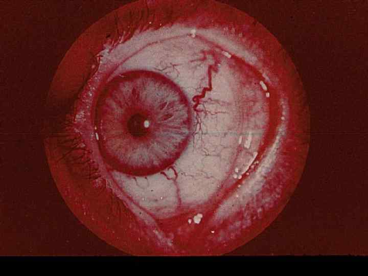 Приступ закрытоугольной глаукомы (слева). Глаз заметно покрасневший Пациент с отеком роговицы видит источники света окруженными цветными ореолами