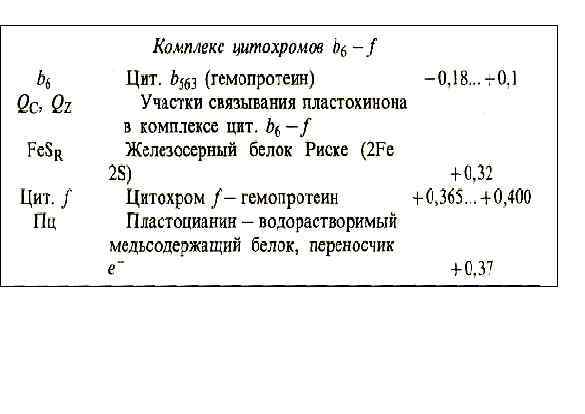 Переносчики электронов и водорода, общие для обеих фотосистем Комплекс цитохромов b 6 - f : B 6 - цитохром b 563 - (гемопротеин) Qc Qz - участки связывания пластохинона Fe. SR - железо-серный белок цитохром f – гемопротеин Пц – пластоцианин – водорастворимый медьсодержащий белок, переносчик электронов PQ/PQH 2 - пул пластохинонов – переносчиков электронов и водорода