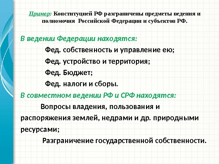 Пример : Конституцией РФ разграничены предметы ведения и полномочия Российской Федерации и субъектов РФ. В ведении Федерации находятся: Фед. собственность и управление ею; Фед. устройство и территория; Фед. Бюджет; Фед. налоги и сборы. В совместном ведении РФ и СРФ находятся: Вопросы владения, пользования и распоряжения землей, недрами и др. природными ресурсами; Разграничение государственной собственности.