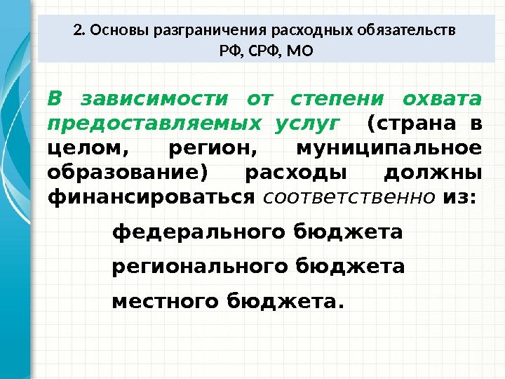 2. Основы разграничения расходных обязательств РФ, CРФ, MO В зависимости от степени охвата предоставляемых услуг (страна в целом, регион, муниципальное образование) расходы должны финансироваться соответственно из: федерального бюджета регионального бюджета местного бюджета.