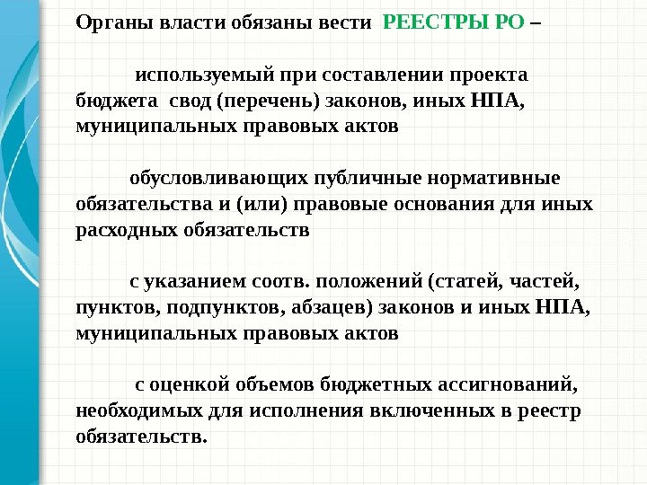 Органы власти обязаны вести РЕЕСТРЫ РО – используемый при составлении проекта бюджета свод (перечень) законов, иных НПА, муниципальных правовых актов обусловливающих публичные нормативные обязательства и (или) правовые основания для иных расходных обязательств с указанием соотв. положений (статей, частей, пунктов, подпунктов, абзацев) законов и иных НПА, муниципальных правовых актов с оценкой объемов бюджетных ассигнований, необходимых для исполнения включенных в реестр обязательств.